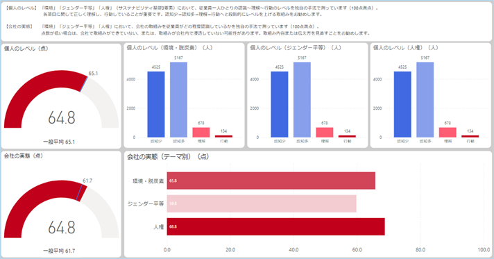行動レベル、会社の取り組みと従業員の認識とのギャップなどを測ります。