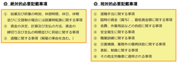 就業規則には、労働基準法(第89条)で定められた「絶対的必要記載事項」と、会社で制度を設ける場合に記載が必要な「相対的必要記載事項」があります。
